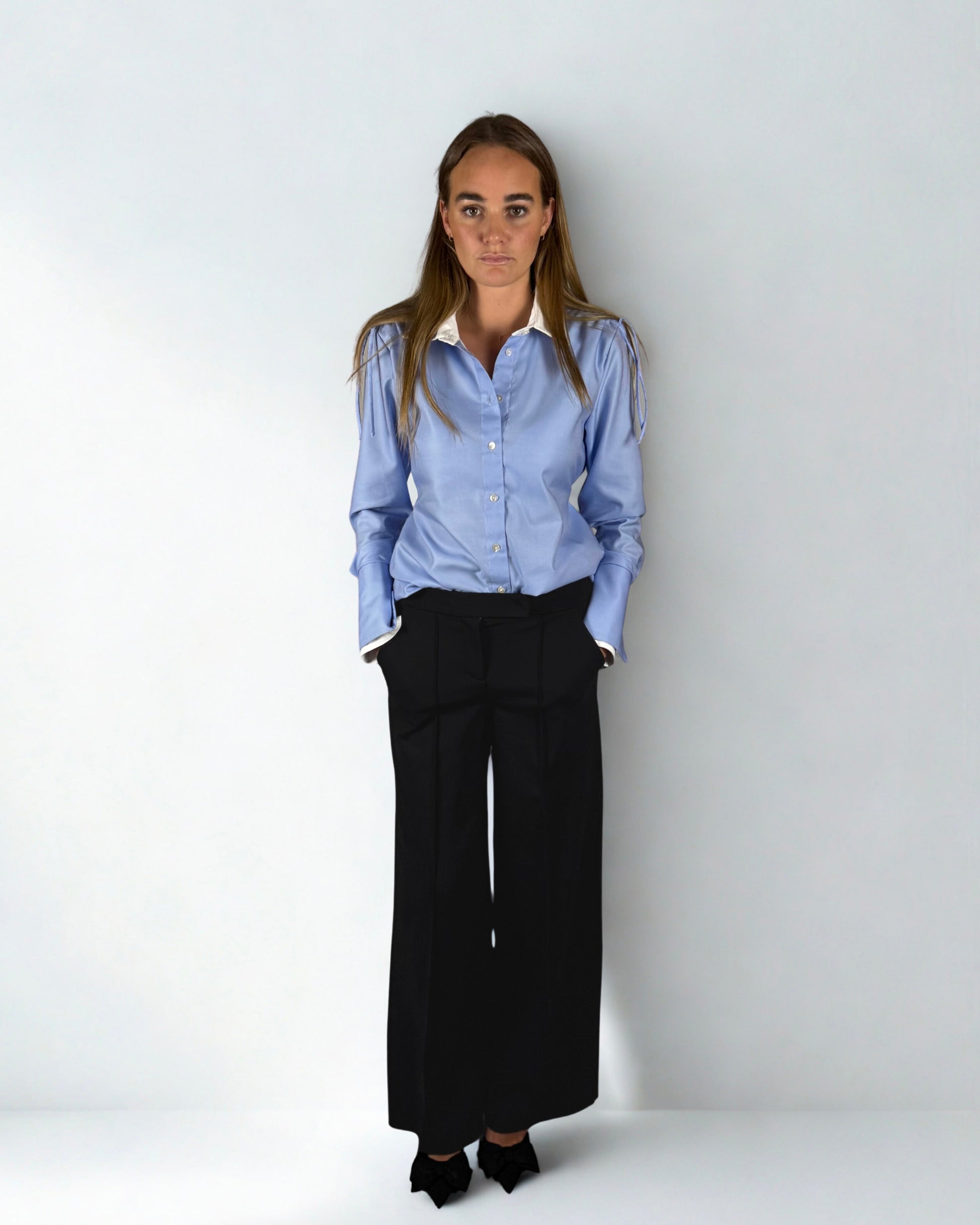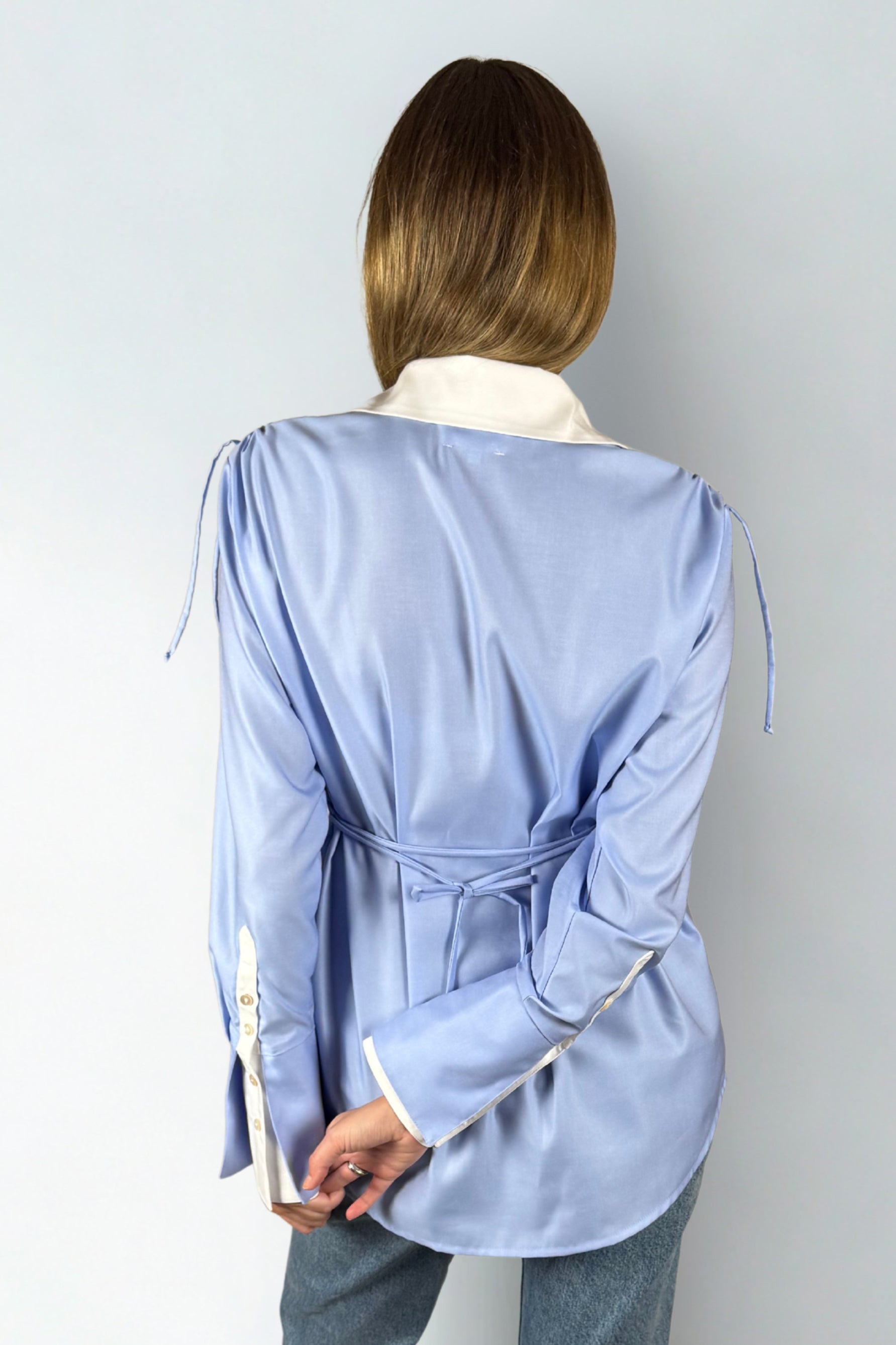 Blaues Hemd mit einer oversized Passform, welches durch Stoffbänder an Schultern und Taille verstellbar ist.