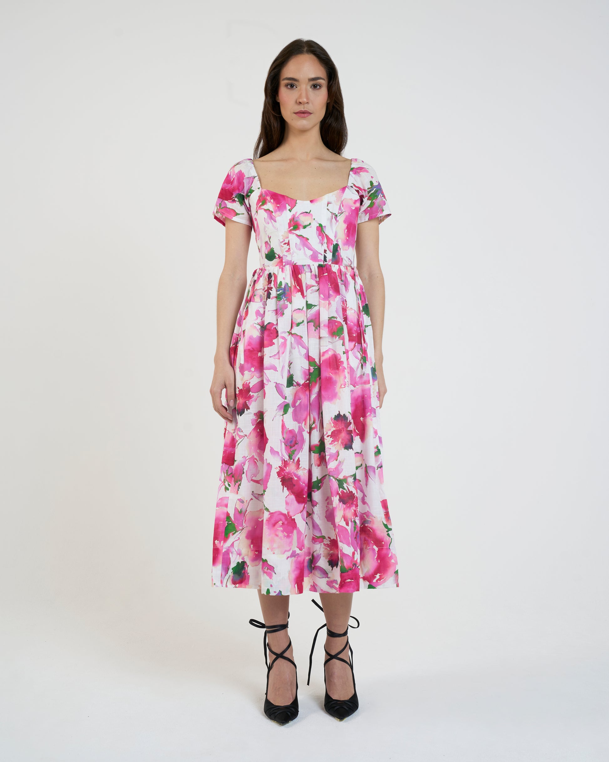 Elegantes Kleid mit pinkem floralen Print. Dieses Kleid bietet vier verschiedene Ärmelvariationen, die sich ganz einfach mit Knöpfen austauschen lassen. Ob trägerlos, zarte Spaghettiträger, kurze oder lange Ärmel, dieses Kleid lässt sich je nach Anlass individuell anpassen. Das Kleid ist vollständig gefüttert und verfügt über zwei seitliche Taschen.